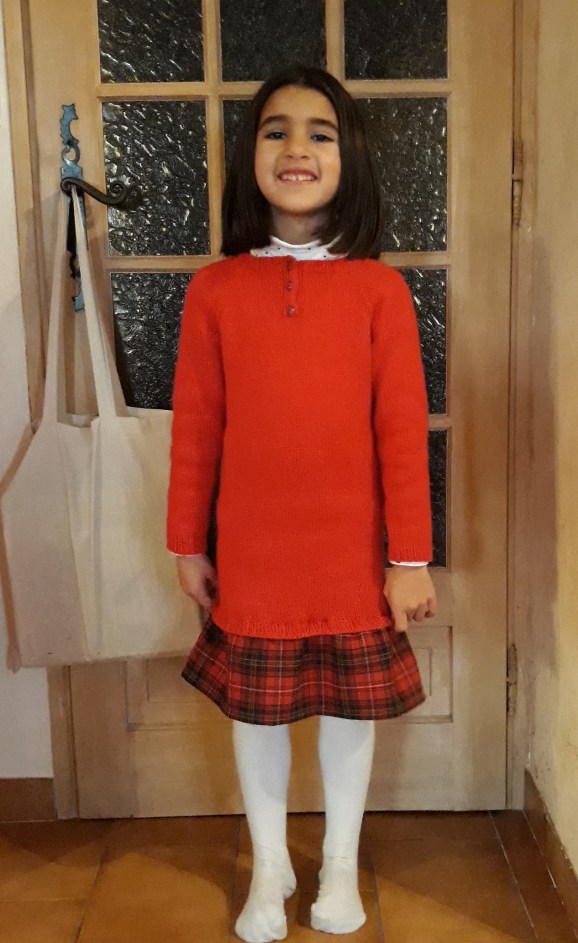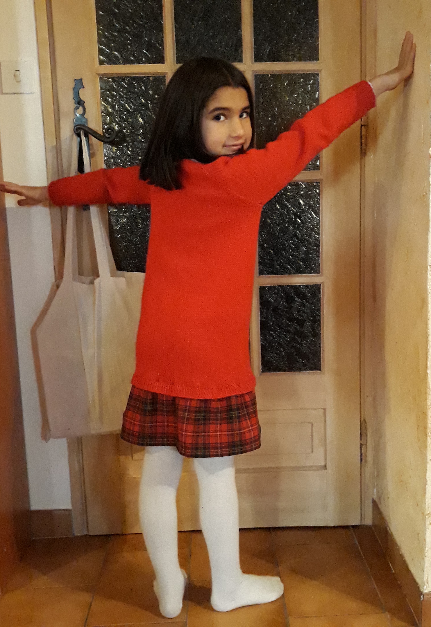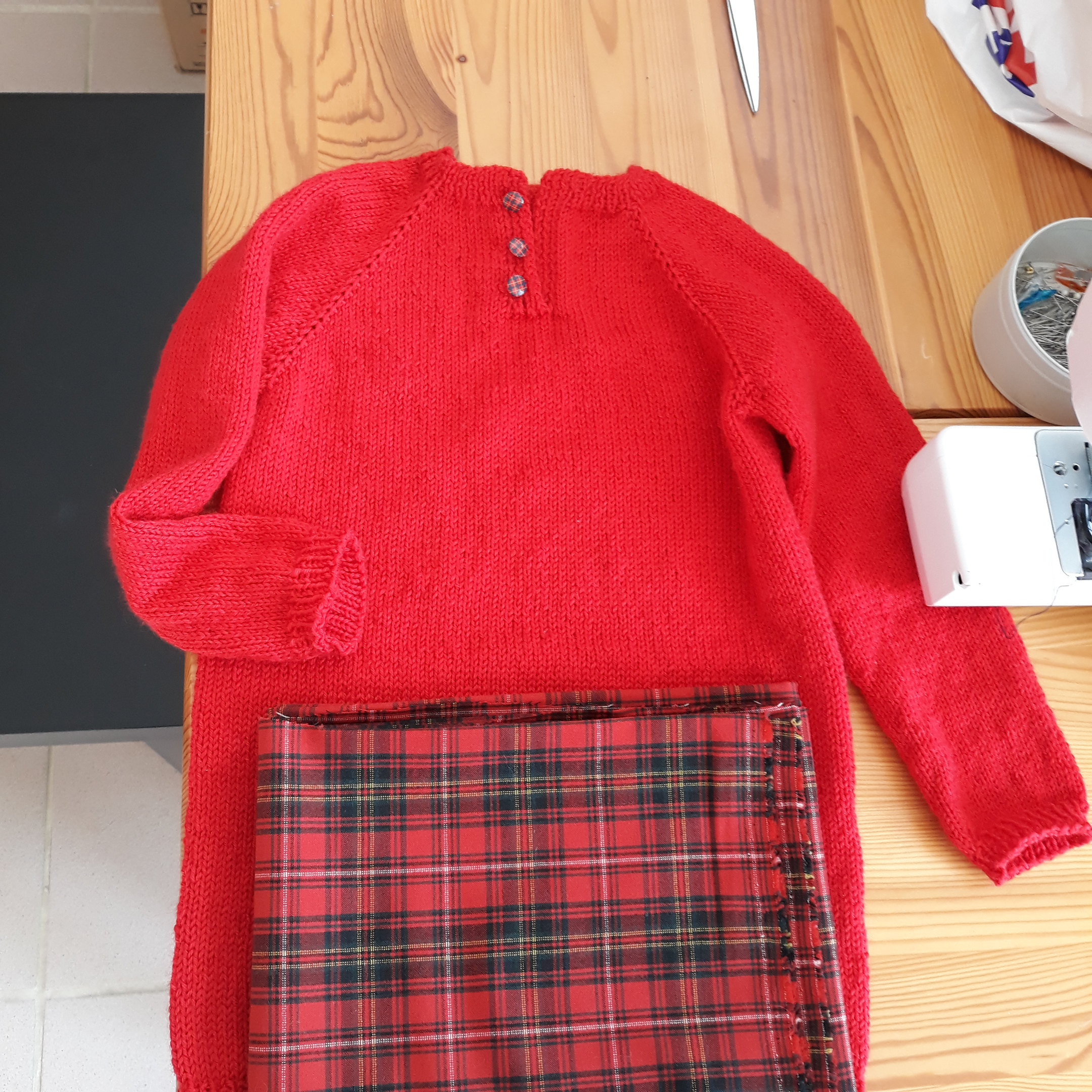 Enfin, j’aime beaucoup les tissus écossais et si je n’avais pas peur de l’en dégoûter, j’en coudrais beaucoup plus à ma fille. Là, j’avais dans mon stock la bonne association entre le tissu et le fil. Le modèle s’appelle Caledonia, qui est le nom latin de l’Ecosse.
