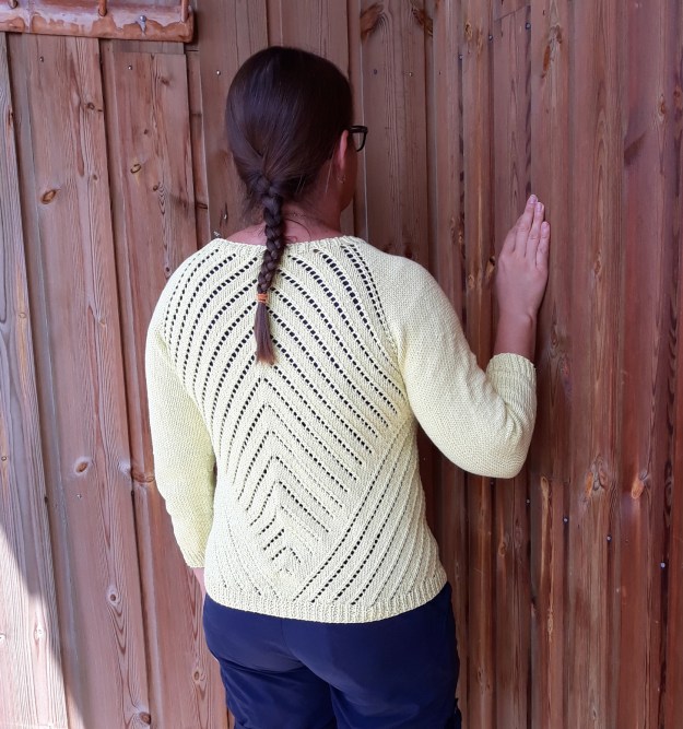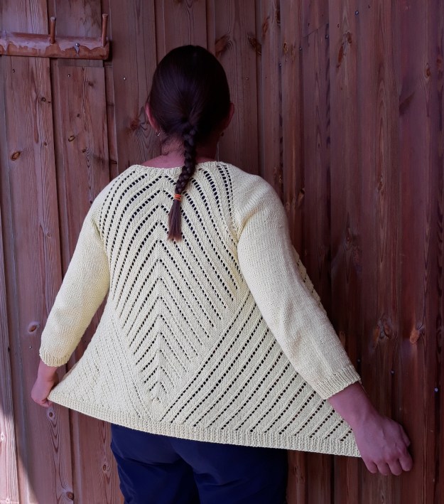 Il s’agit d’un gilet, dont les devants et le dos sont en dentelle. Une dentelle tout simple, juste faite de jetés et de diminutions, qui crée des lignes de trou-trous. Les lignes du devant viennent peu à peu se répandre dans le dos et forment ainsi un dos très graphique, j’ai envie de dire « spectaculaire », mais je suis modeste !