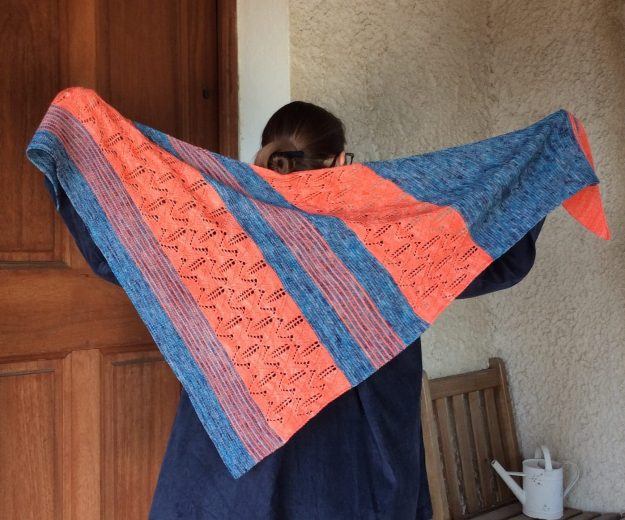 Ces dernières années, de nombreuses teinturières indépendantes se sont lancées, notamment en France, et l’offre est devenue abondante, ce qui constitue une formidable source d’inspiration pour les designers de modèles. Et certaines de ces teinturières ont réussi à développer une véritable personnalité, une « patte ». Angélique fait partie de celles-ci. Et ce n’est pas la première fois que je tricote ses fils, puisque la couleur principale de la version bicolore de mon châle Ressac était déjà une de ses réalisations…