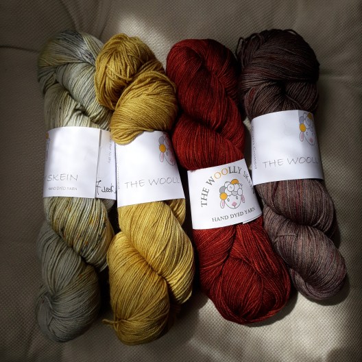 Mais je le voulais avec une encolure V. J’ai aussi choisi moins de couleurs : 4 seulement. Surtout, Je voulais associer 4 écheveaux que j’avais achetés en plusieurs fois chez une jeune teinturière, The Woolly Skein. 4 couleurs qui portent de jolis noms : « A rock in my shoe », « Corn field », « Sugar maple » et « Spicy ». Le fil, quant à lui, s’appelle « Fingers crossed », c’est du 100% mérinos.