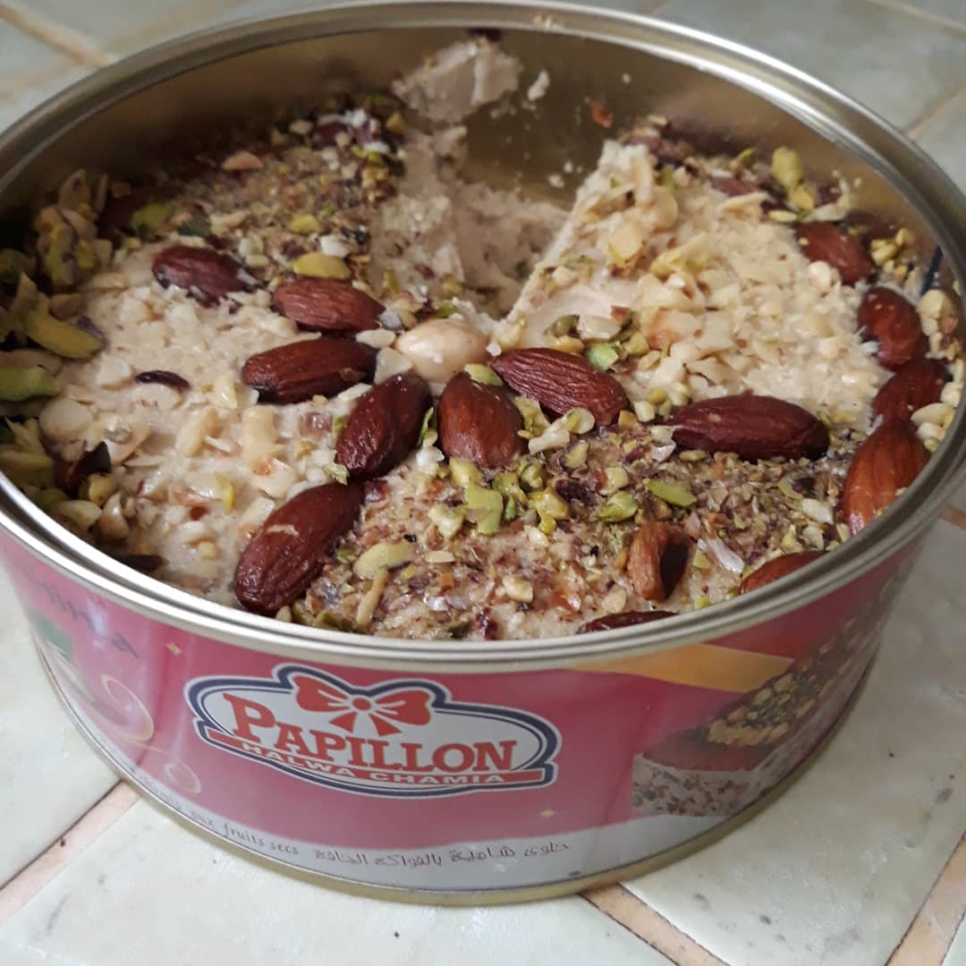 J’ai nommé ce gilet Halwa, car il est inspiré du gilet Friandise. Et « halwa » est la traduction arabe de « friandise ». Après coup, je me suis rendue compte que mon gilet était aux couleurs de la halwa chamia, une confiserie faite de pâte de sésame agrémentée de fruits secs (pistaches, amandes, pignons, noix,…), qu’on trouve vendue en boîtes en Tunisie (notamment) et qu’on nous offre souvent.