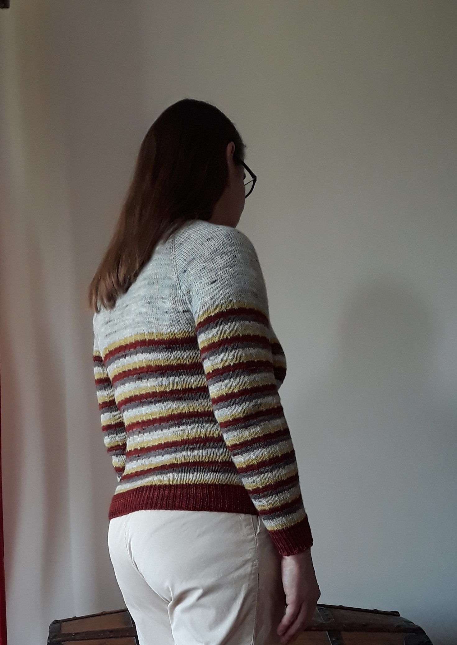 Mais je le voulais avec une encolure V. J’ai aussi choisi moins de couleurs : 4 seulement. Surtout, Je voulais associer 4 écheveaux que j’avais achetés en plusieurs fois chez une jeune teinturière, The Woolly Skein. 4 couleurs qui portent de jolis noms : « A rock in my shoe », « Corn field », « Sugar maple » et « Spicy ». Le fil, quant à lui, s’appelle « Fingers crossed », c’est du 100% mérinos.