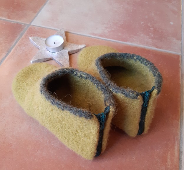 Les voici avant feutrage. Cette étape peut faire un peu peur, si vous ne l’avez jamais fait, mais c’est vraiment très facile et tout est expliqué dans le modèle. En gros, vous n’avez qu’à mettre les chaussons dans votre machine à laver !