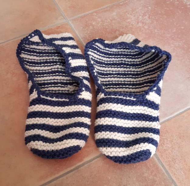 Pour les chaussons rayés (que j’ai surnommés « Le pied marin » !), il vous faudra 1 à 2 pelotes de chaque coloris.