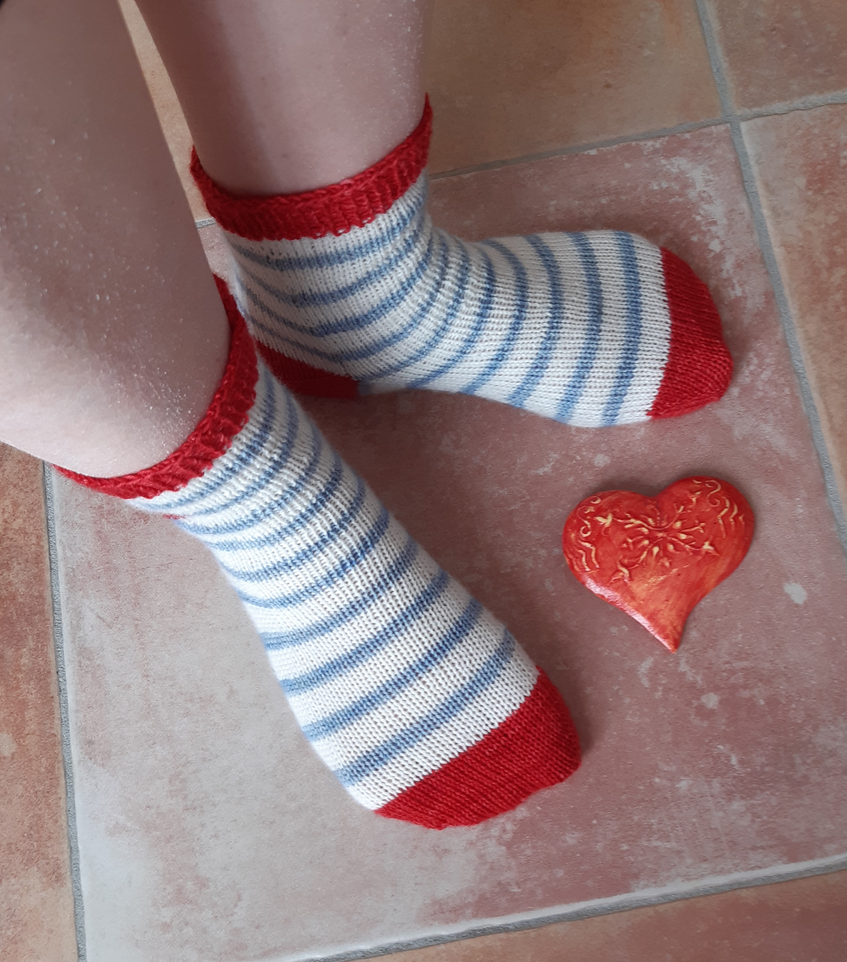 Il s’agit de chaussettes à rayures, avec orteils, talons et bordure contrastante, ainsi qu’un motif de coeur sur l’extérieur de la cheville.