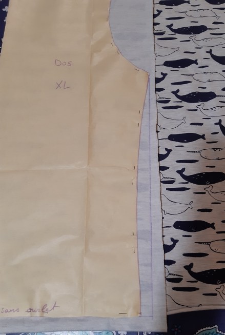 En ouvrant la pochette (très sympa au passage), je me suis aperçue que le modèle était « ajusté ». Comme ce n’est pas le genre de la maison, j’ai simplement tracé une ligne sur les côtés du corps, afin d’avoir une coupe plus droite.