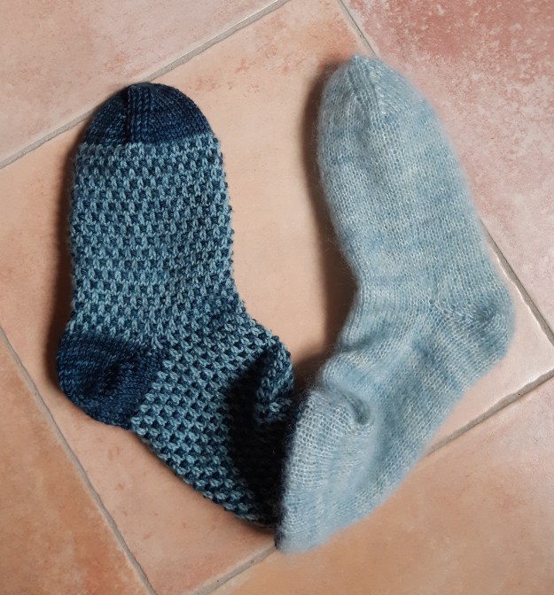 Une fois arrivé en haut de cette première chaussette, on tricote à la suite la chaussette intérieure. Et là attention, c’est du mohair et soie (ici, j’ai tricoté le fil Poilues de (Vi)laines, en coloris Gober l’oeuf bleu d’une caille), autant dire que c’est d’une douceur incroyable.