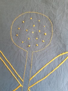 Pour l’écumoire, j’ai brodé le contour en point avant, façon sashiko, et j’ai opté pour le point de noeud pour évoquer les petits trous. Mes premiers noeuds ne sont pas très réussis, mais petit à petit je suis parvenue à attraper le coup de main.