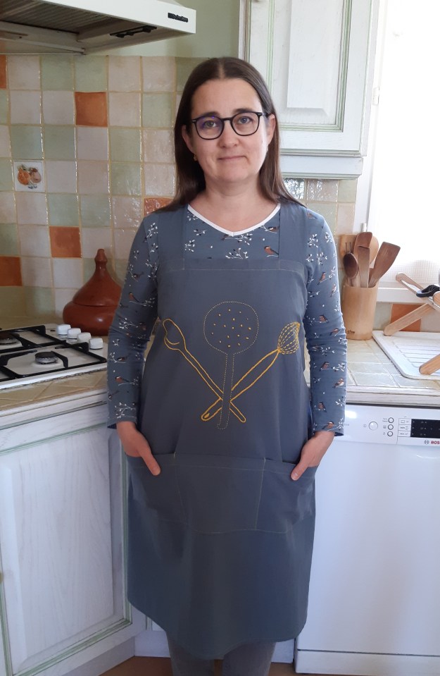 Pour la broderie, j’ai créé moi même le motif, car j’avais une idée bien précise en tête. J’ai d’abord dessiné sur une feuille de papier pour voir le rendu, puis sur le tablier avec un feutre lavable. Et ensuite j’ai brodé. J’ai choisi de border avec des points différents, car je souhaitais saisir l’occasion pour essayer différents points et me perfectionner en broderie.