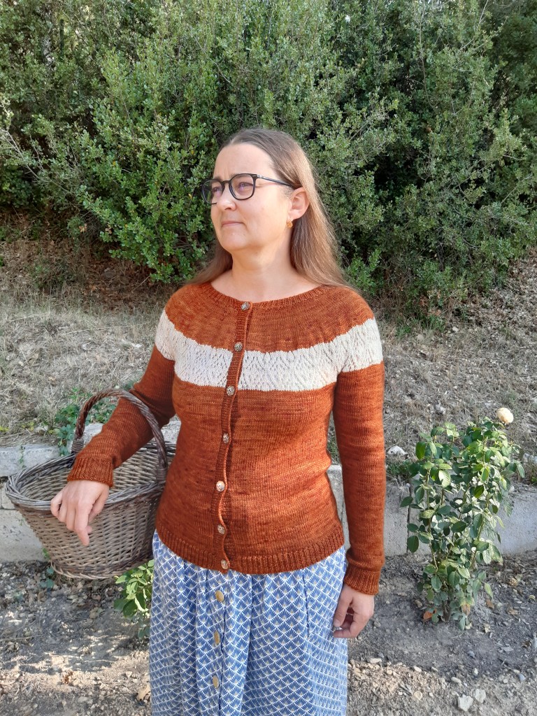 Quand Aurélia (La Pelote Vagabonde) a sorti son coloris « Bataille de pralines » en décembre dernier, j’ai aussitôt imaginé un gilet très féminin, agrémenté d’une jolie guirlande de dentelle.