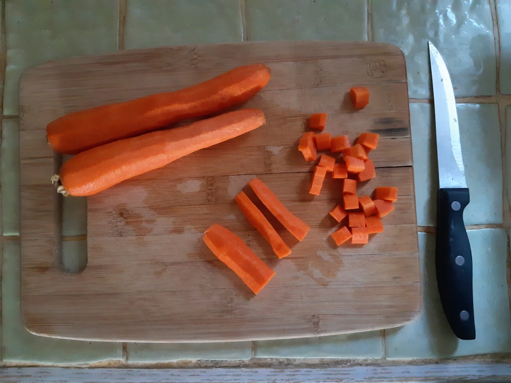 Eplucher, laver et couper les carottes en petits cubes et les faire cuire dans de l’eau bouillante salée jusqu’à ce qu’ils soient tendres.