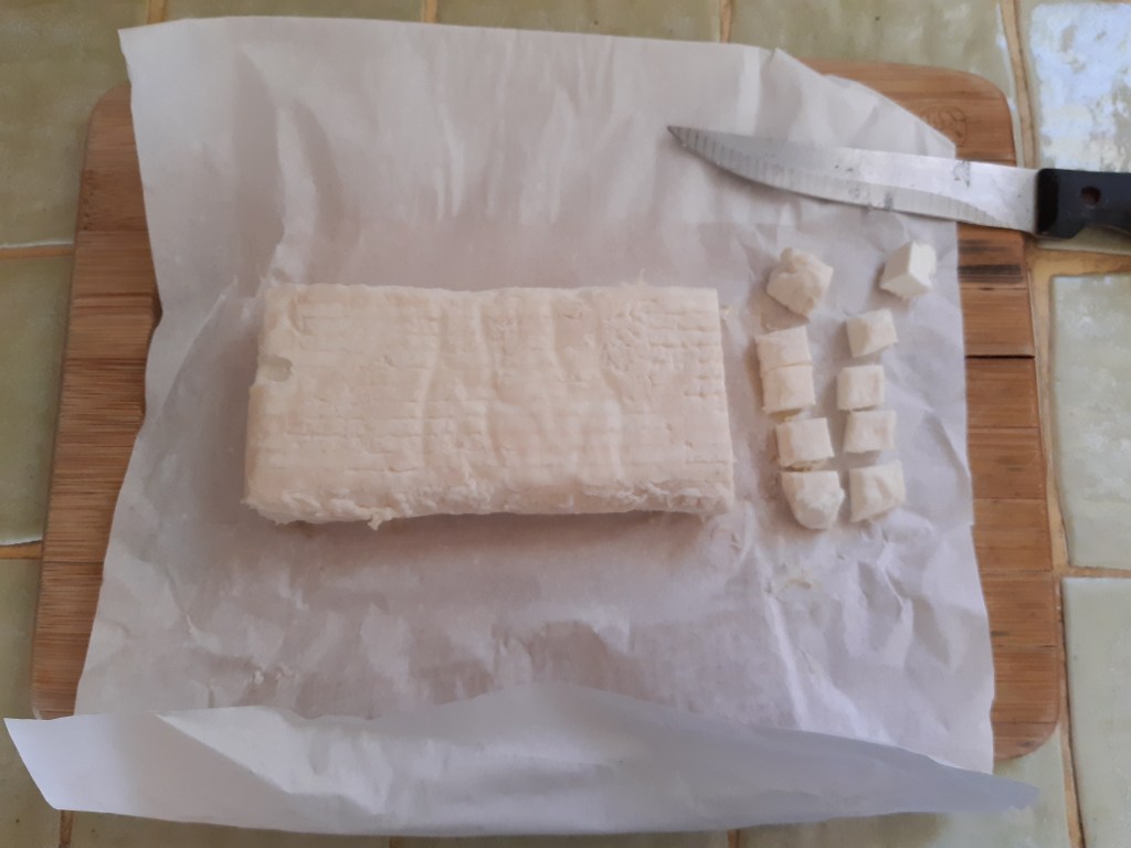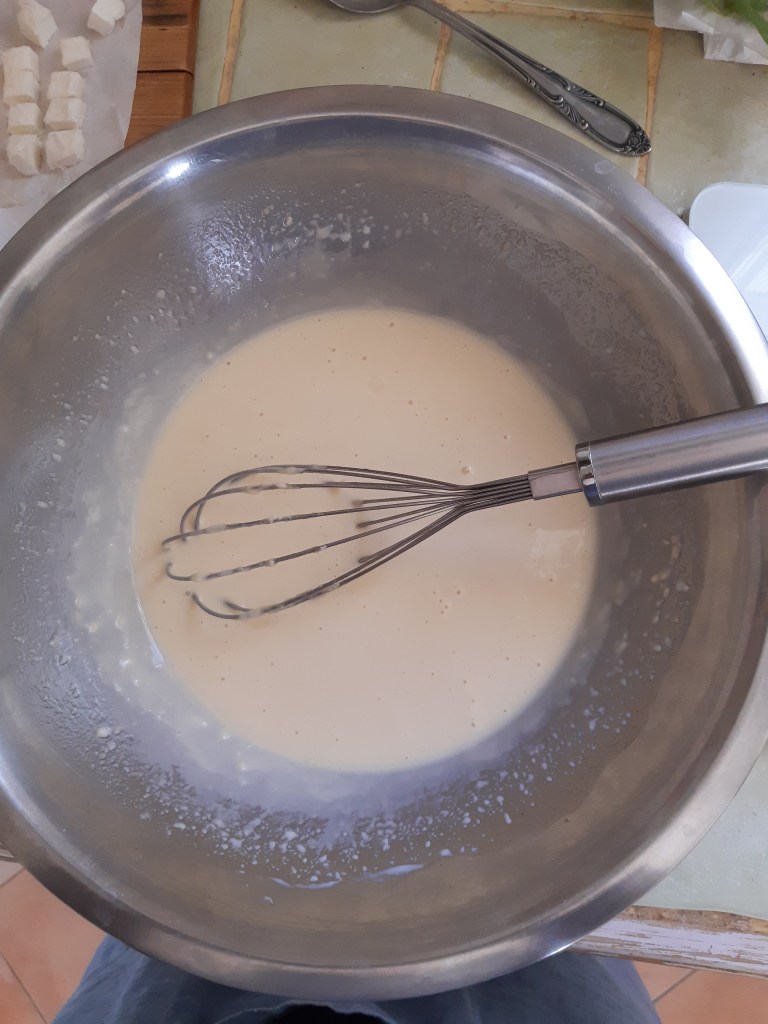 Couper la brique de chèvre en petits dés. Les verser dans la préparation et mélanger délicatement pour ne pas les écraser.