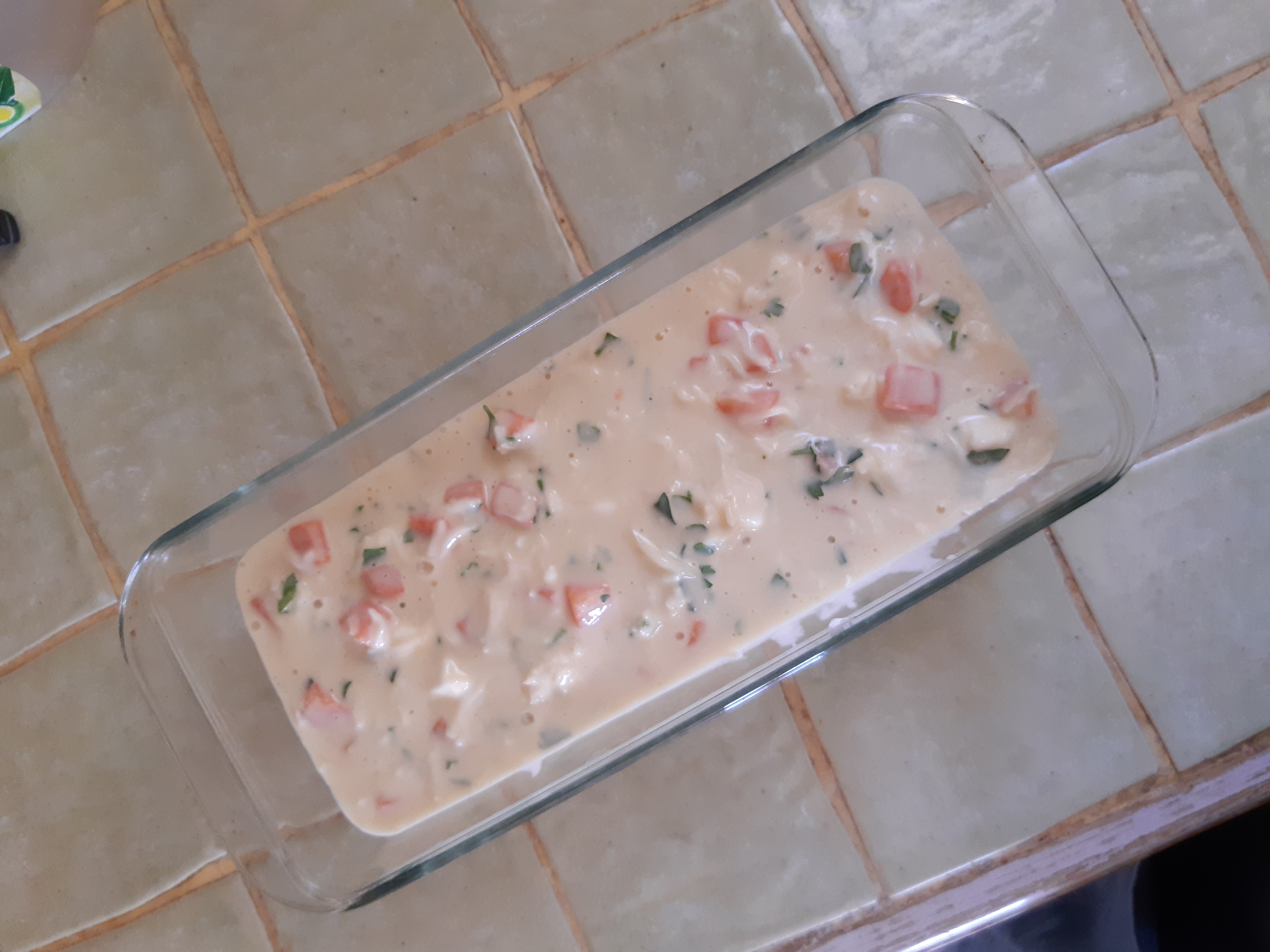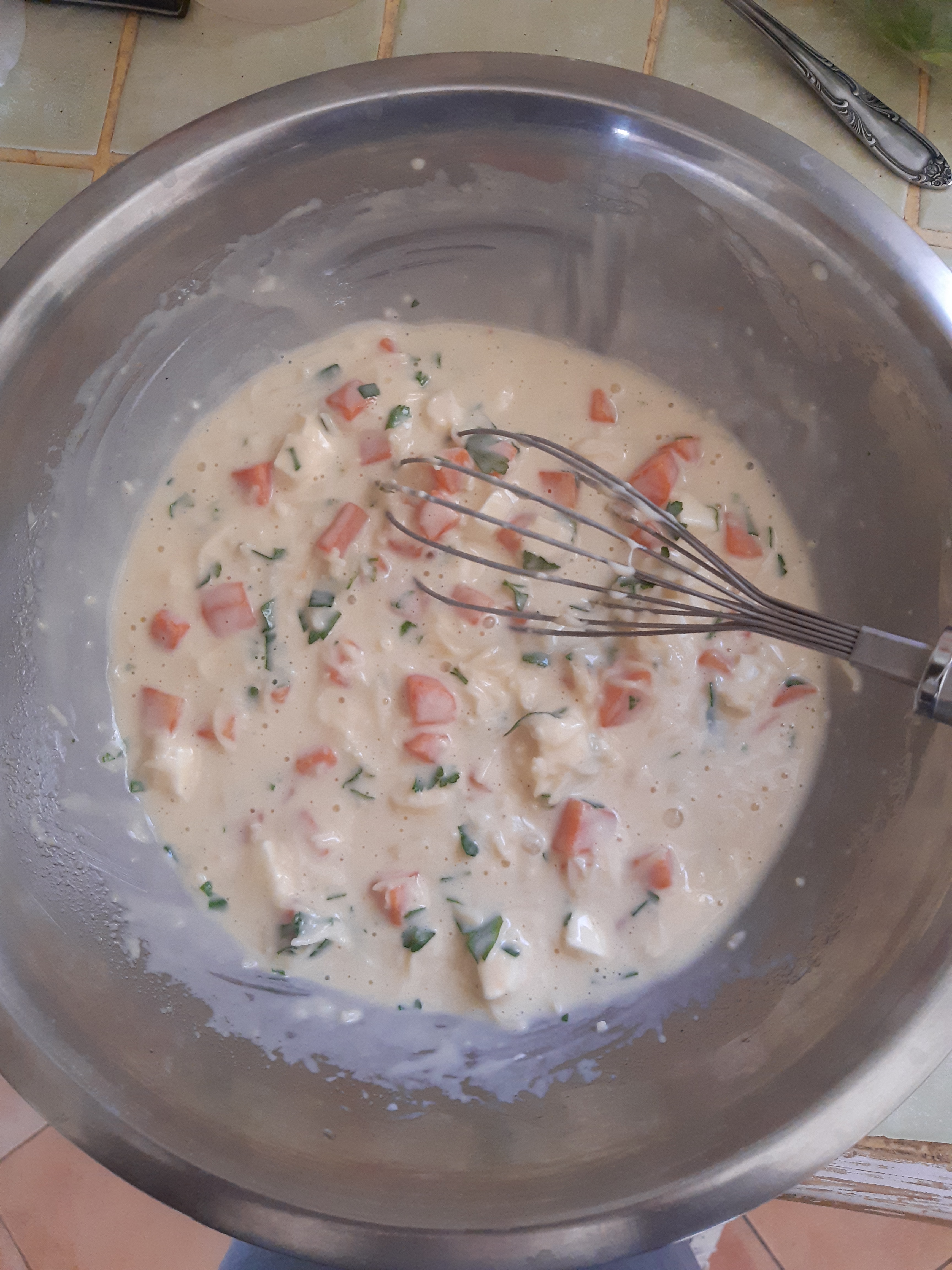 Couper la brique de chèvre en petits dés. Les verser dans la préparation et mélanger délicatement pour ne pas les écraser.