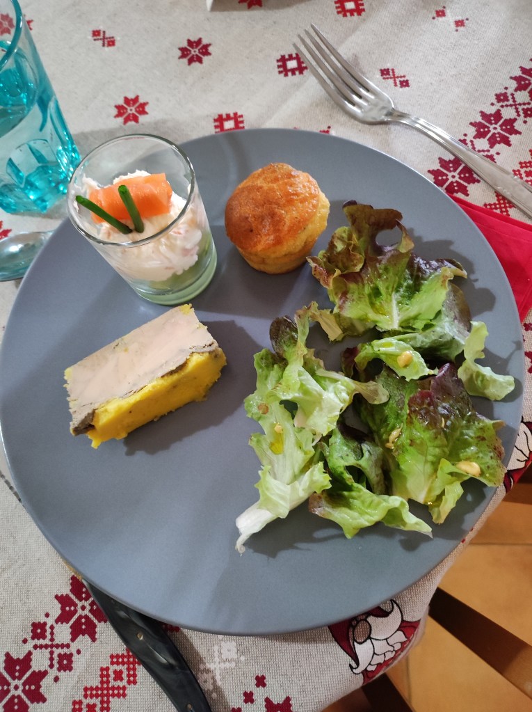 Mon entrée était composée d’un mini muffin, d’une tranche de foie gras, de salade verte et d’une verrine (concombre coupé en petits cubes, mascarpone battu avec de la crème fraîche et du saumon fumé coupé en petits morceaux, décorée d’un morceau de saumon fumé et de brins de ciboulette).