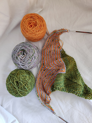 J’ai tellement eu de plaisir à réaliser ce châle que j’ai voulu en faire un deuxième – pour moi – ce qui m’a aussi permis de mettre au point les explications. Cette fois, j’ai choisi un ensemble de couleurs totalement différent, mais qui me plaît énormément aussi : deux écheveaux d’Abri de La Pelote Vagabonde (coloris Golden Hour et Lichen) et un écheveau des Petits Points Parisiens (coloris Luxembourg). Ces trois écheveaux étaient déjà rangés ensemble dans mes tiroirs et attendaient le bon projet…
