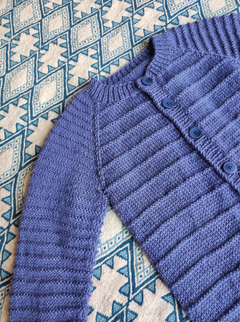 Je ne vais pas faire un article très long, car ce gilet reprend beaucoup d’éléments du pull. C’est la même construction, de haut en bas, avec des emmanchures raglan et sans couture. On retrouve évidemment le même motif de rangs en jersey envers à un rythme différent sur les manches et sur le corps. La principale différence tient à la présence d’une bande de boutonnage sur le devant – normal, c’est un gilet !