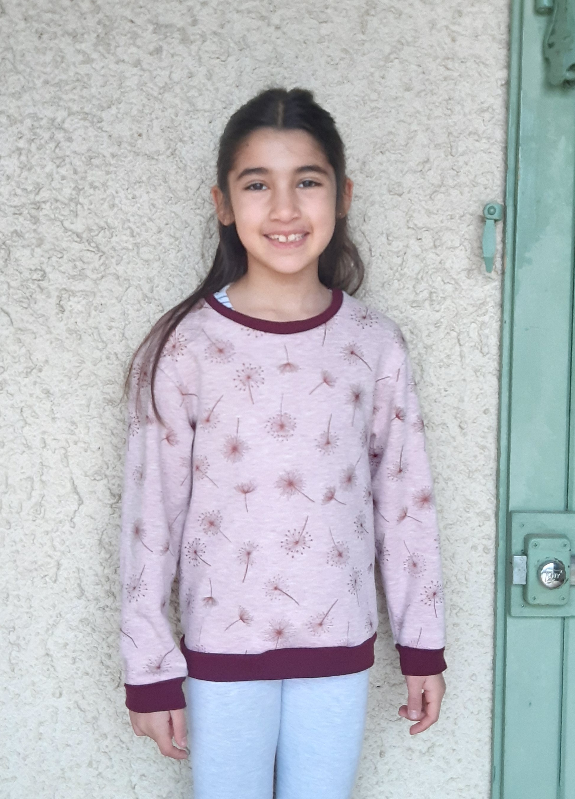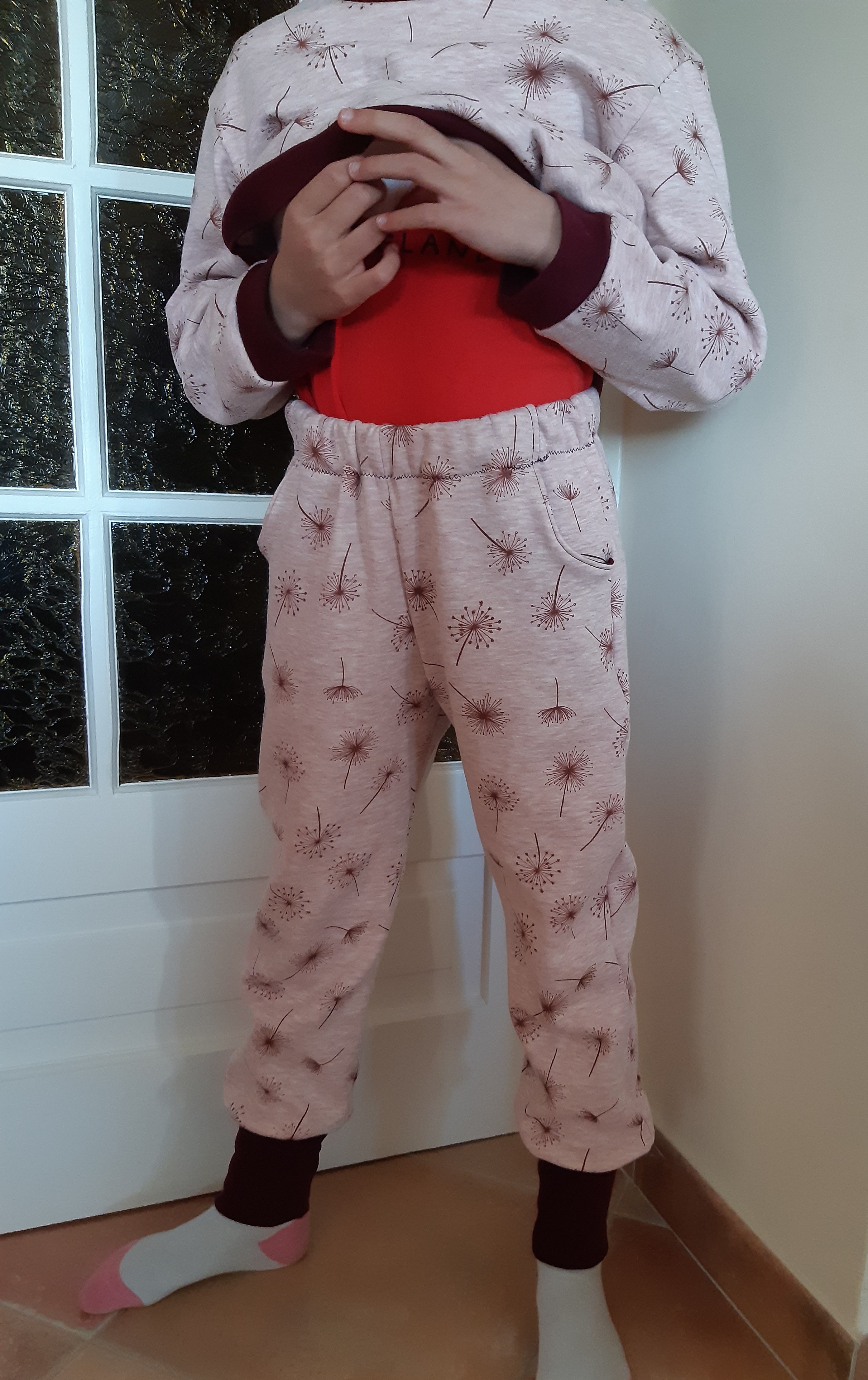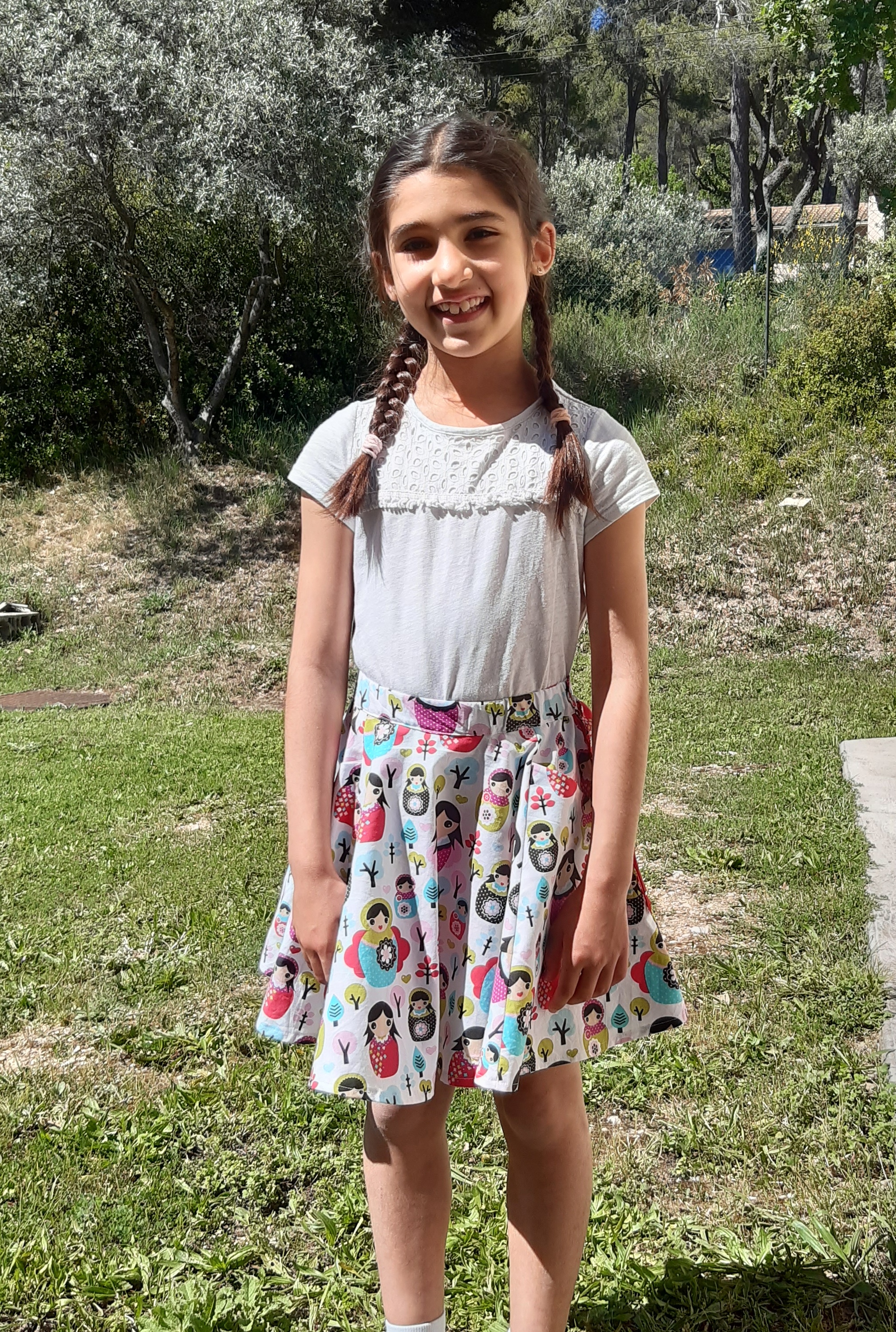 Après avoir fait un premier essai, j’ai fait quelques ajustements pour que ce soit mieux adapté à ma fille: j’ai réduit en largeur, même si, au vu du tableau des tailles, j’avais déjà choisi une taille inférieure à la sienne, à savoir le 10 ans (le patron prévoit les tailles intermédiaires 9 et 11 ans, ce qui est un plus). J’ai aussi élargi la partie haute du devant, en faisant une échancrure moins prononcée. J’ai réalisé ce modèle dans une chute de jersey, avec un élastique à lingerie.