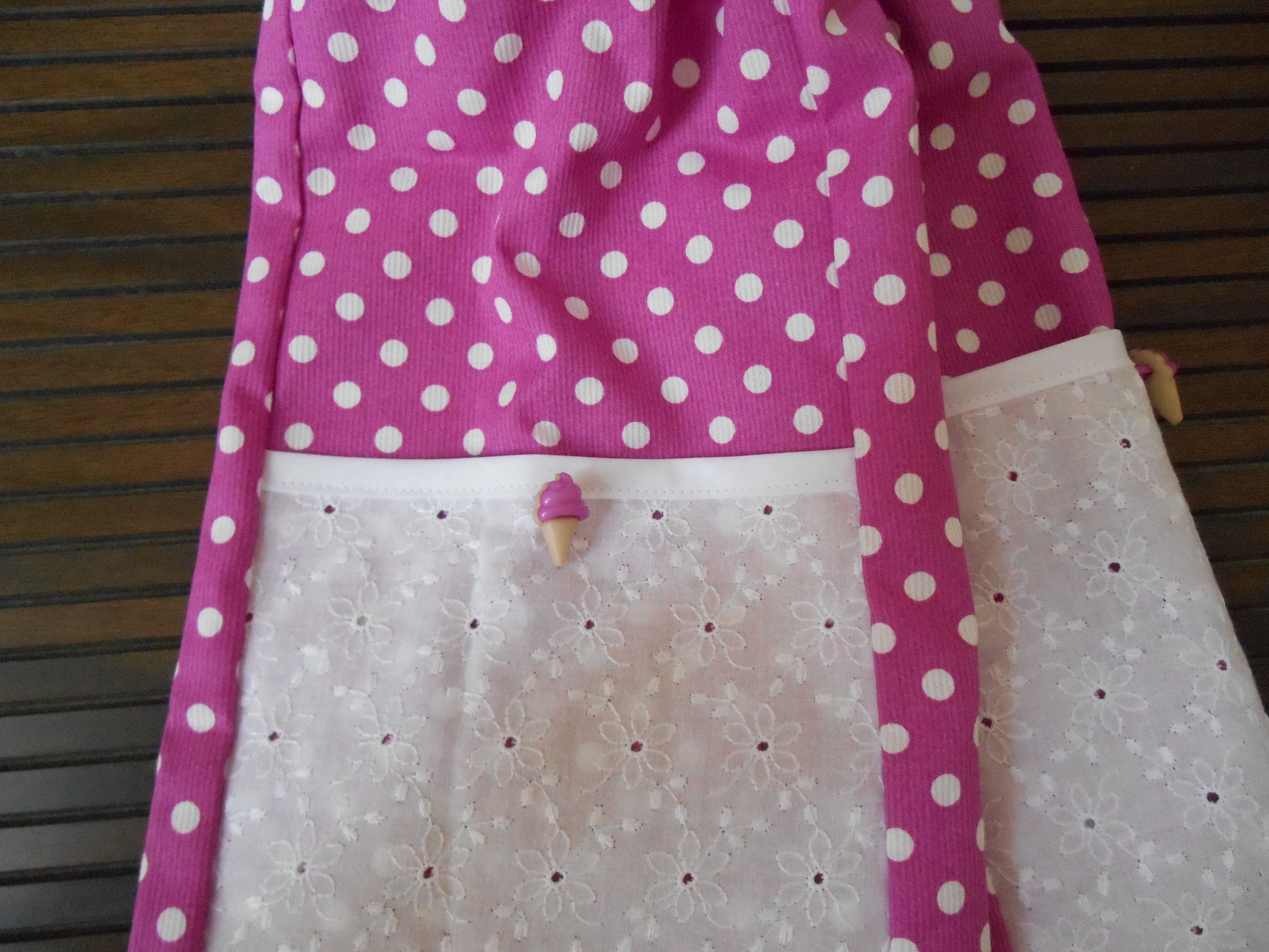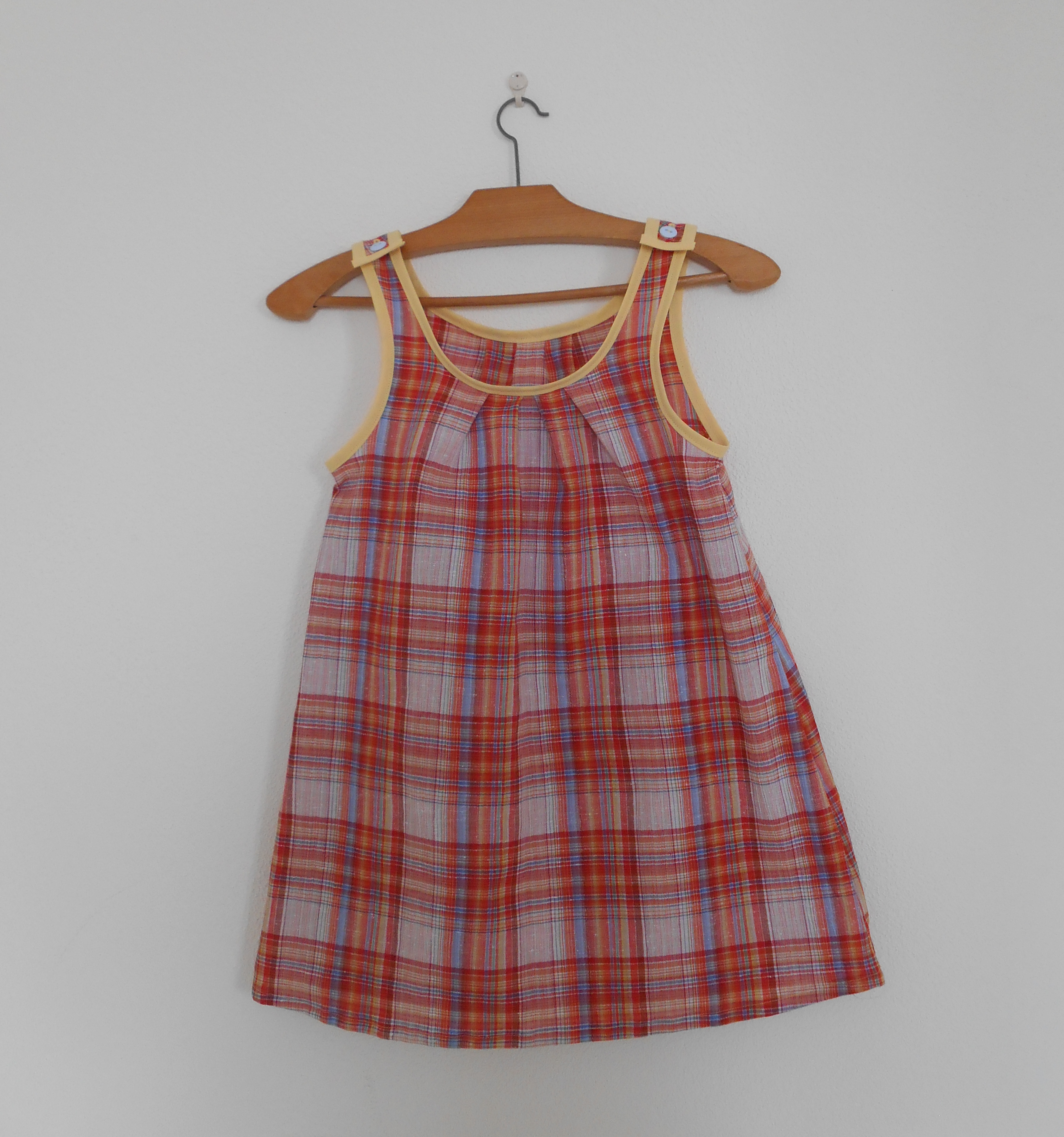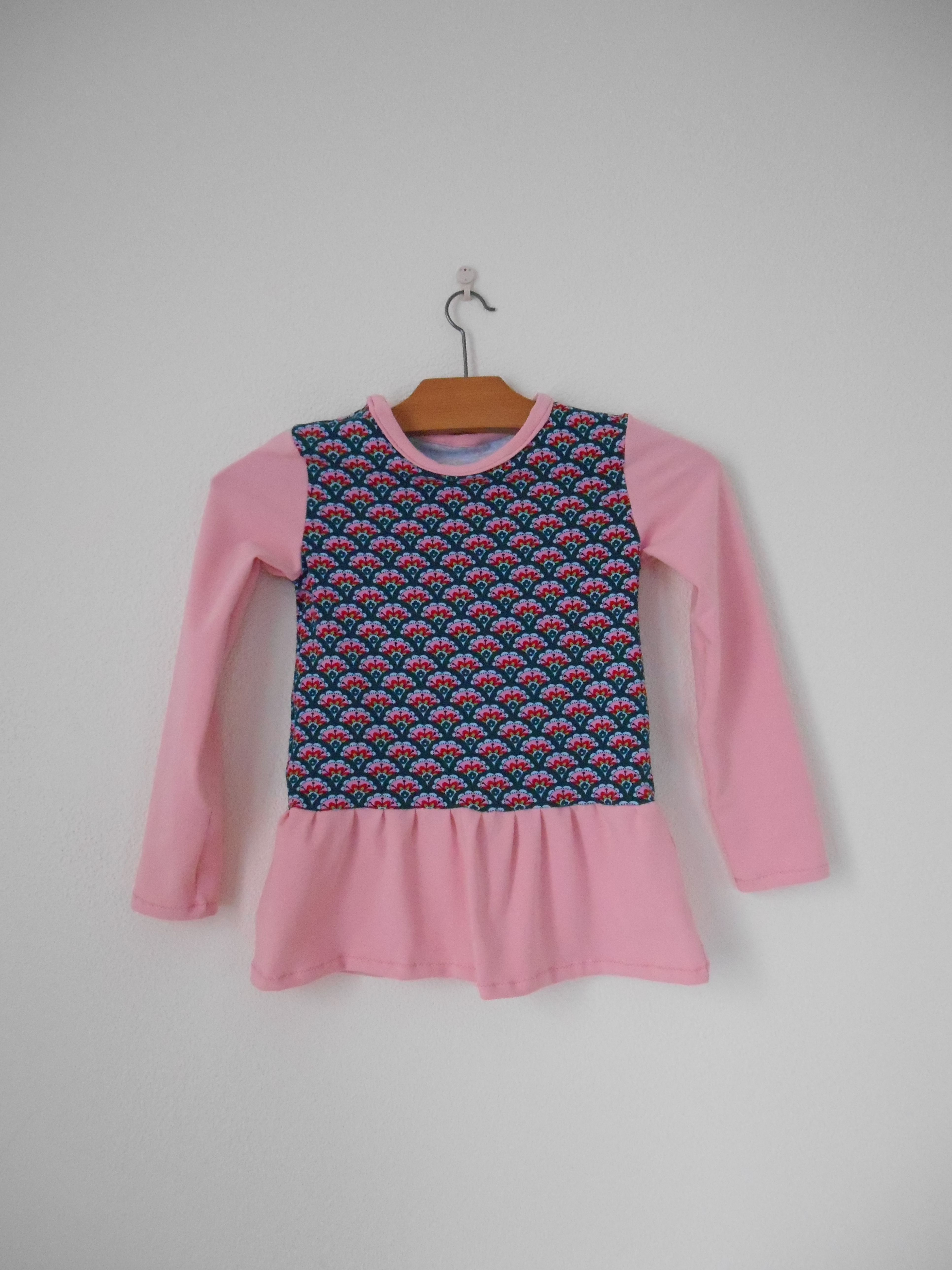 Comme il me restait du tissu et que la miss avait flashé dessus quand elle l’avait vu (et je la comprends !), je lui ai aussi fait une jupe. Même tissu, même ruban de pompons, mais autre modèle de jupe (modèle perso en fait) pour avoir une jupe à volants et qui tourne…