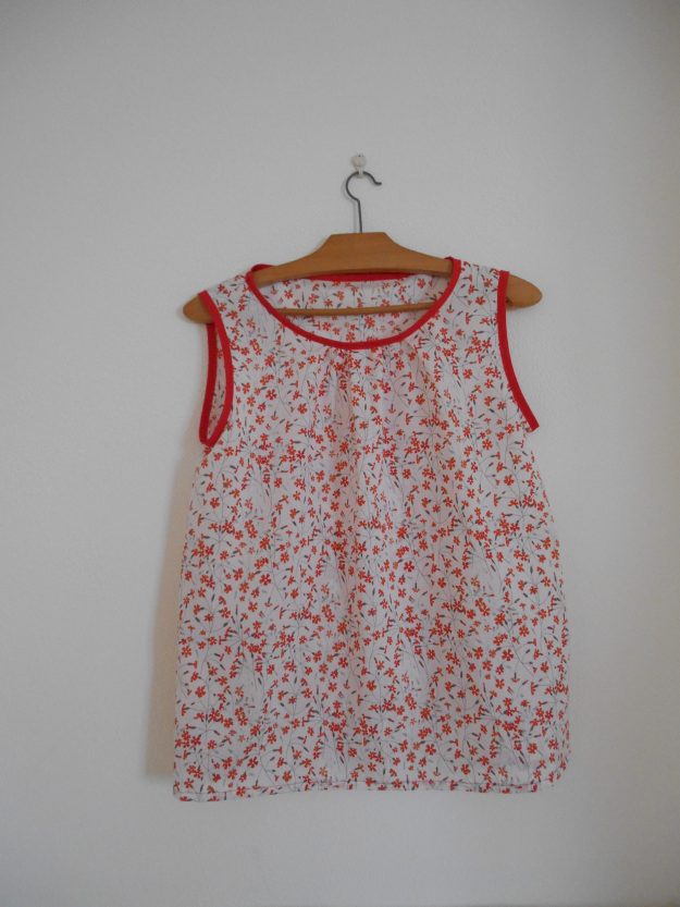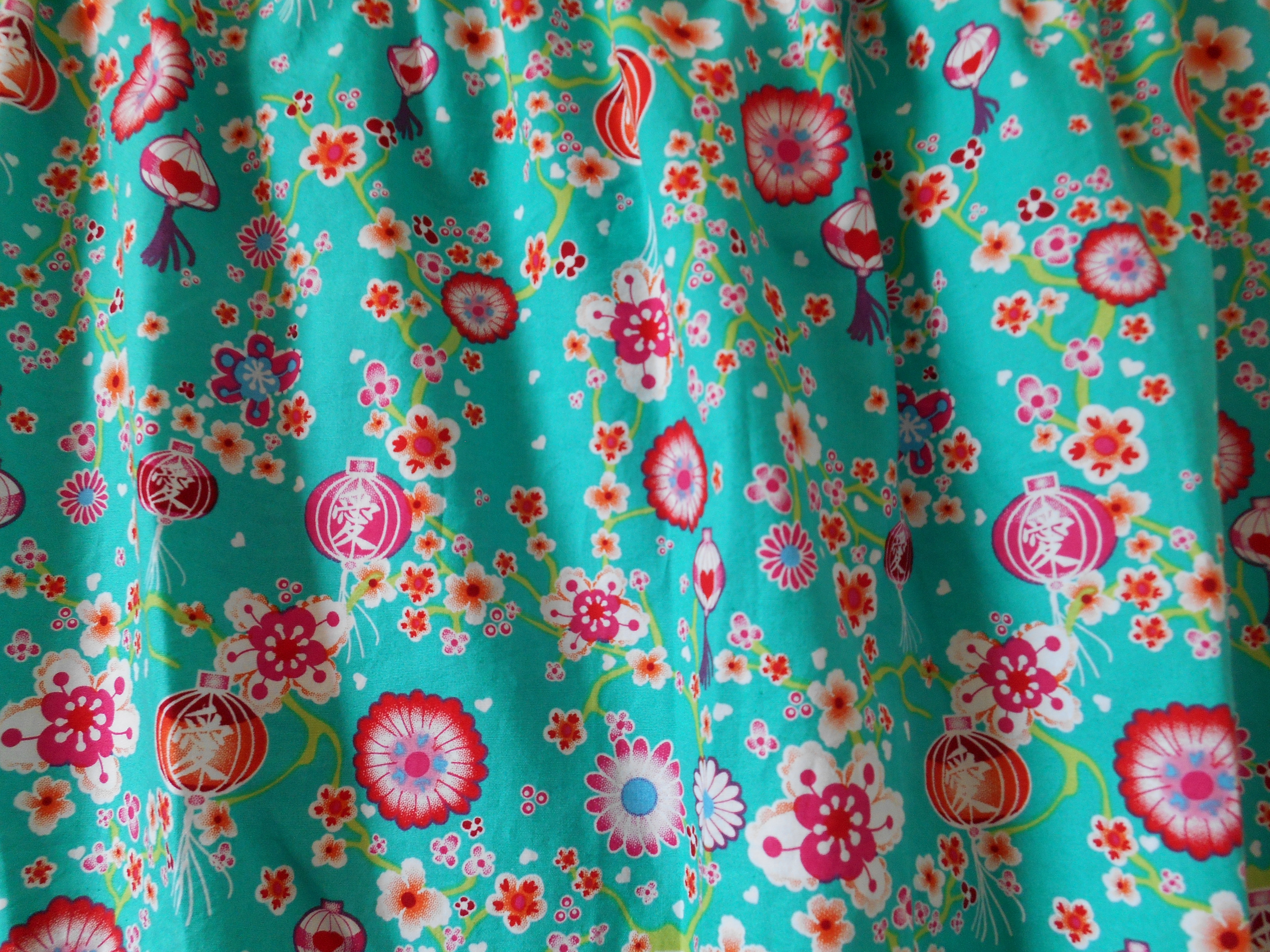 Et ce tissu, justement, je ne me souviens plus d’où il vient, car il y a un moment que je l’ai acheté. Il me plaît beaucoup, mais je ne me voyais finalement pas faire un haut avec, car j’avais peur que cela fasse trop enfantin. En revanche, en longue jupe, je trouve qu’il rend très bien. Il est gai et coloré et tout à fait estival. Et autre avantage de ce modèle : il ne faut pas beaucoup de tissu, 1 mètre en 140 de large suffit amplement.