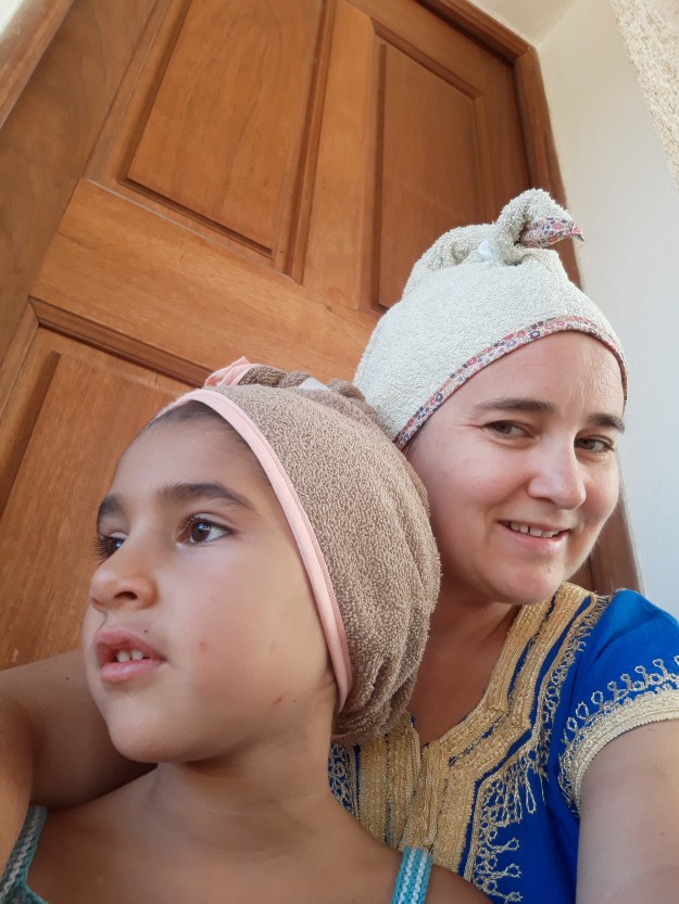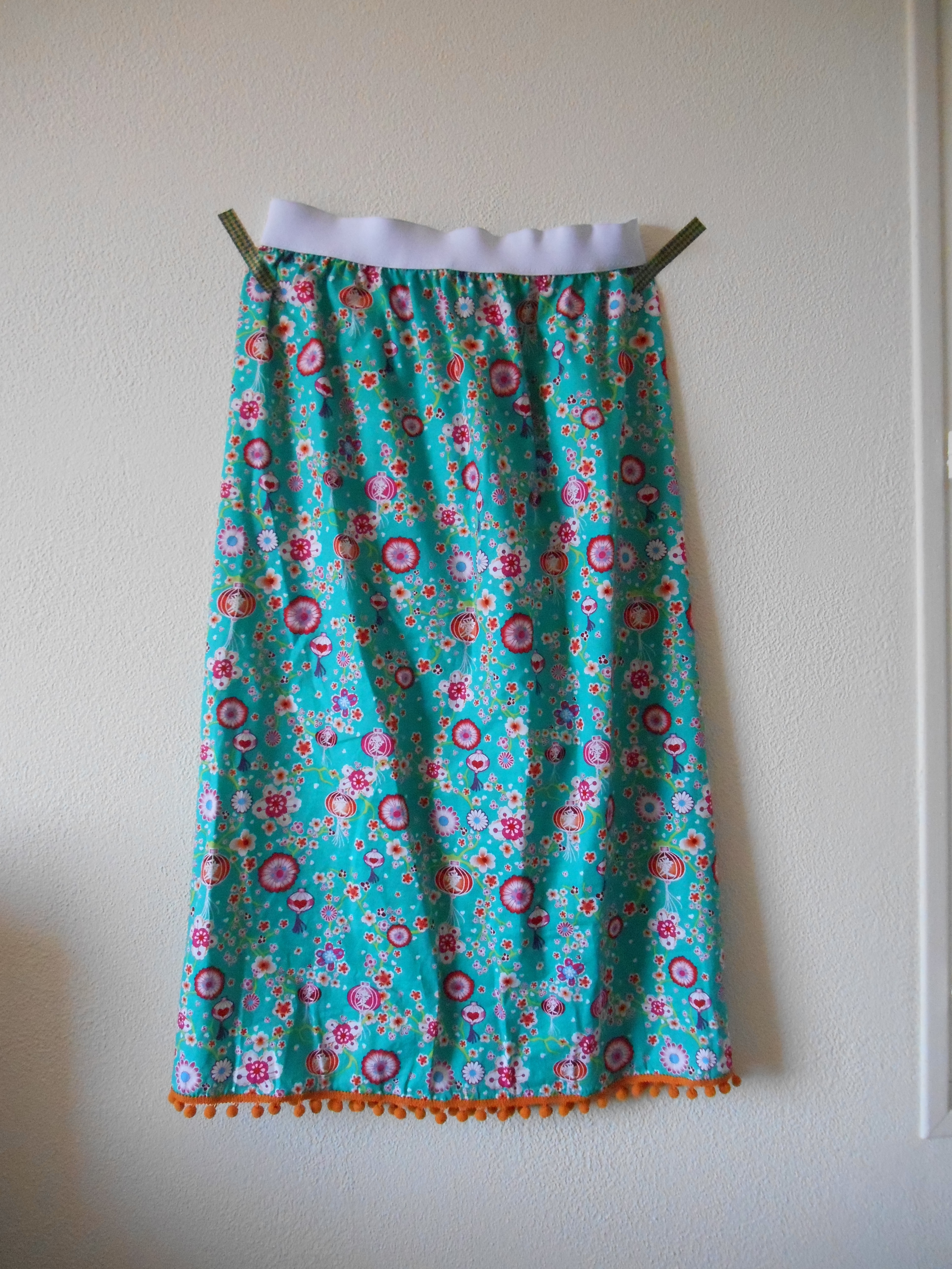 Je l’ai faite en taille 38. Comme je ne suis pas très grande, je l’ai faite un peu plus courte : 80 cm au lieu de 84 pour ma taille. J’ai ajouté un ruban de petits pompons dans le bas pour accentuer le côté oriental et exotique du tissu.