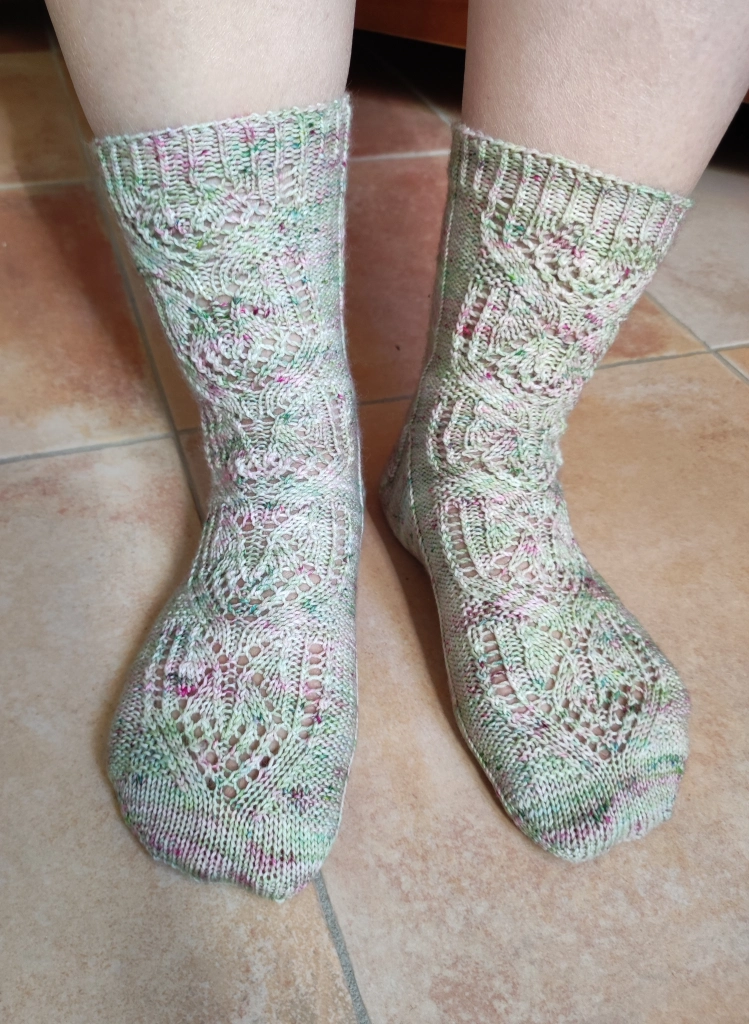 Ces chaussettes portent un superbe motif de dentelle sur le dessus du pied. J’aime beaucoup ce motif, auquel je trouve un côté art déco. Il est proche de celui que j’ai utilisé pour le châle Ligeia. D’ailleurs Ligeia et Pisinoé sont toutes les deux sirènes dans la mythologie grecque.
