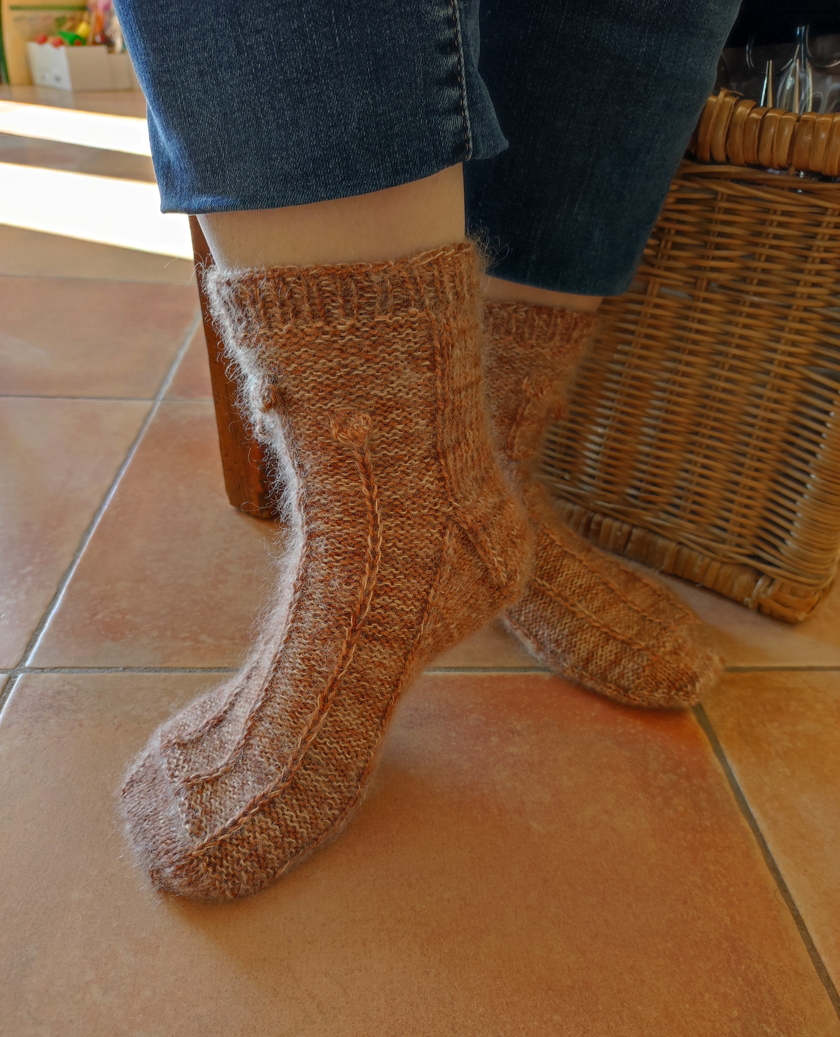 Voici leur recette: prenez votre fil chaussette préféré et doublez-le avec un fil mohair et soie et vous obtiendrez vos nouvelles chaussettes préférées, celles que vous enfilerez dès votre arrivée à la maison et que vous ne voudrez plus quitter ! Vous êtes prévenues !