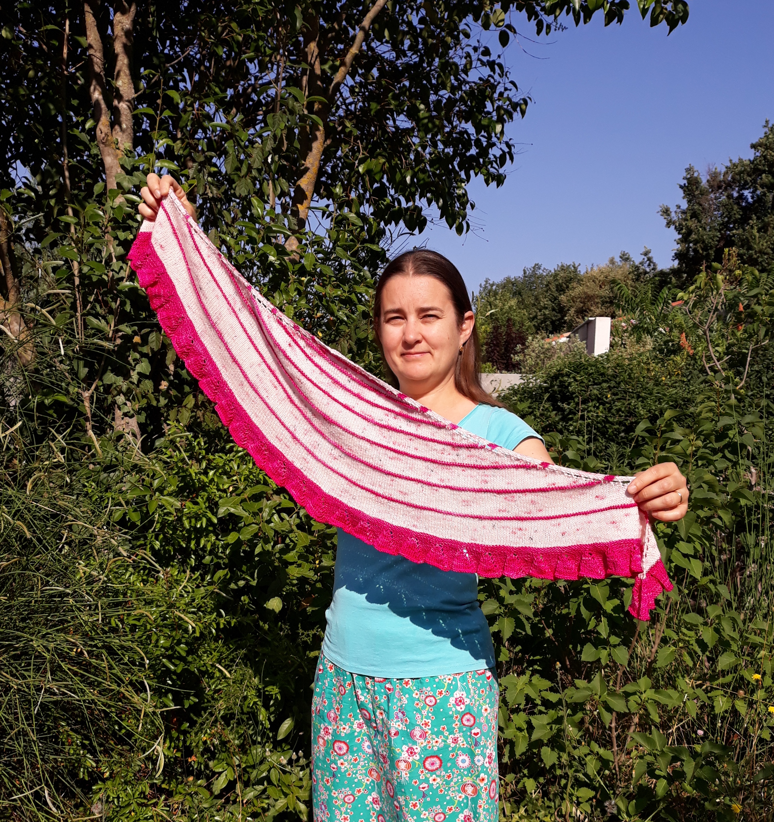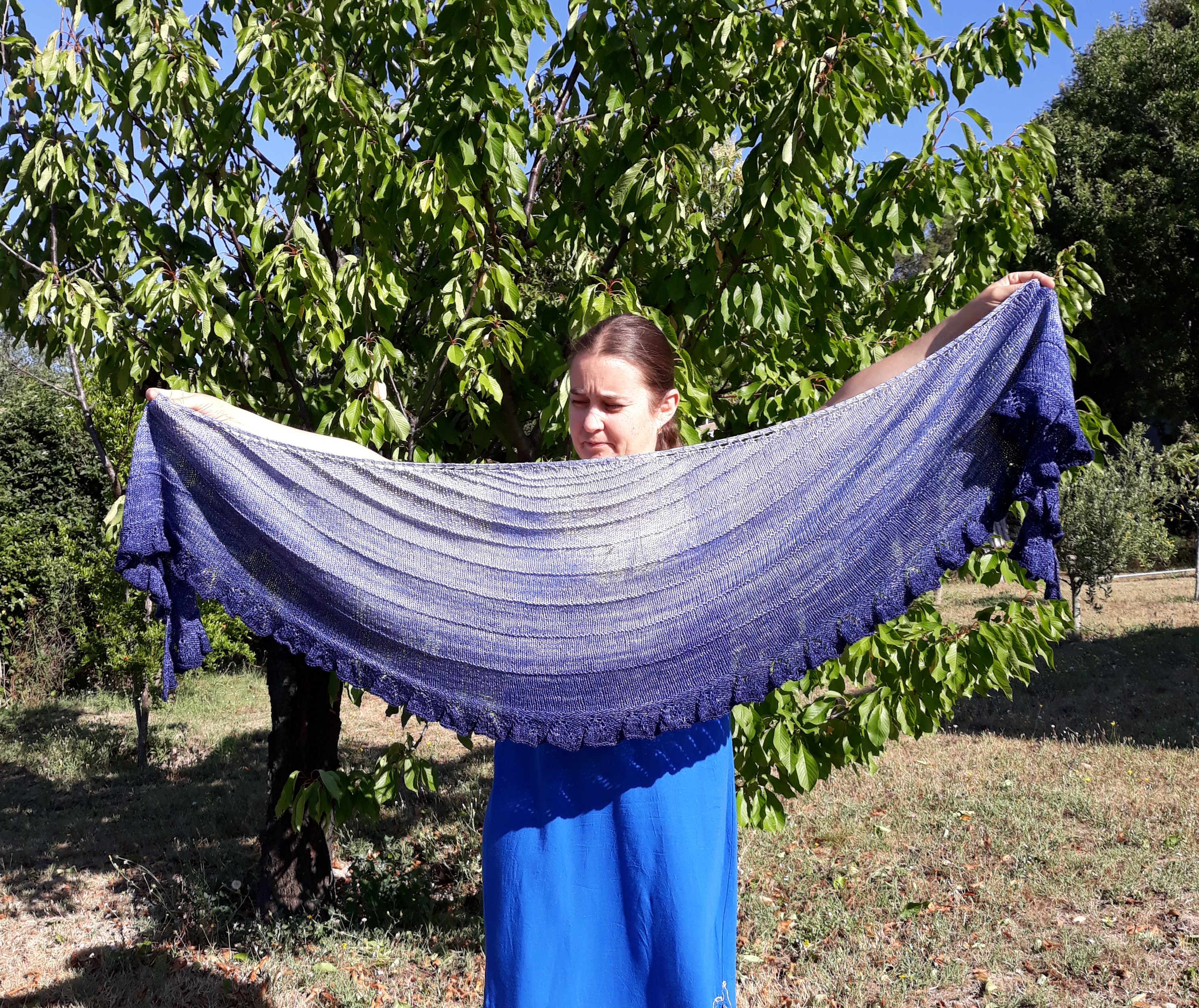 Pour tout dire, j’ai adoré construire ce châle. C’était un peu comme un voyage : on voit les motifs se dérouler au fur et à mesure qu’on avance, les couleurs évoluer et alterner, comme des paysages… Bref, je ne me suis pas ennuyée et je crois que mes testeuses non plus.