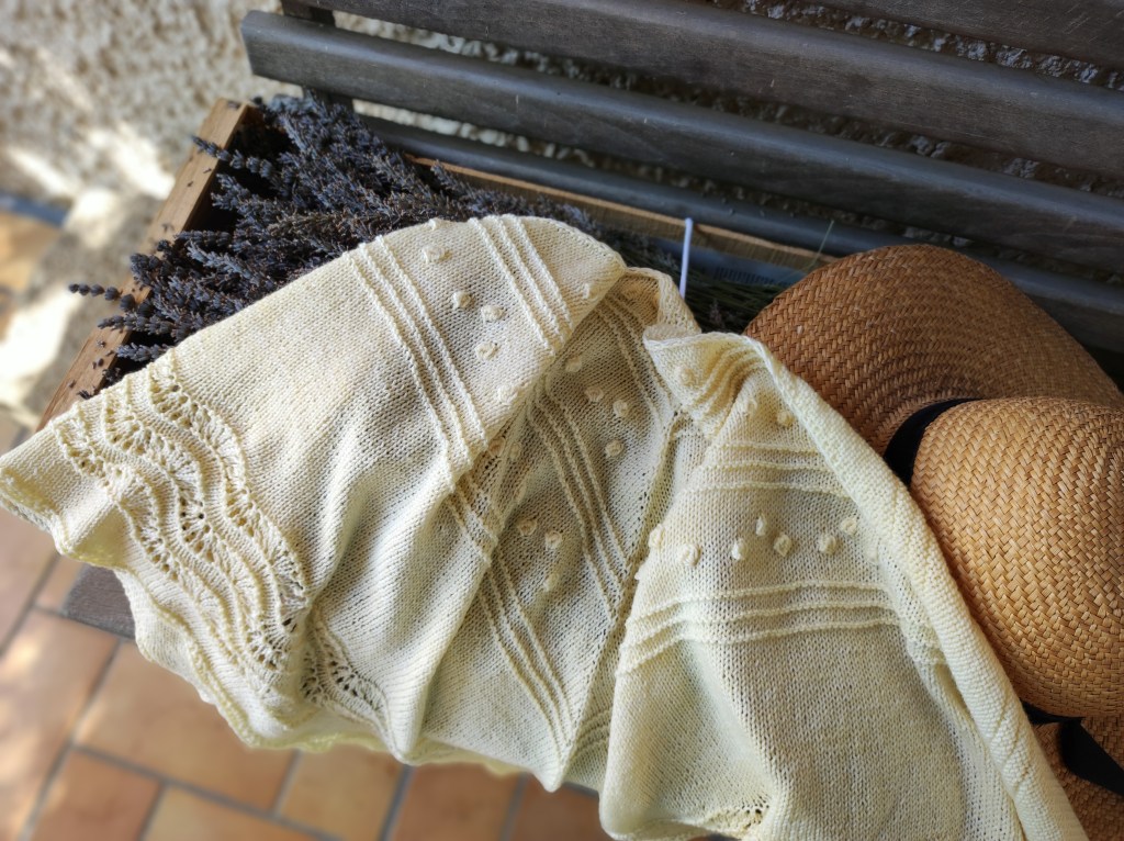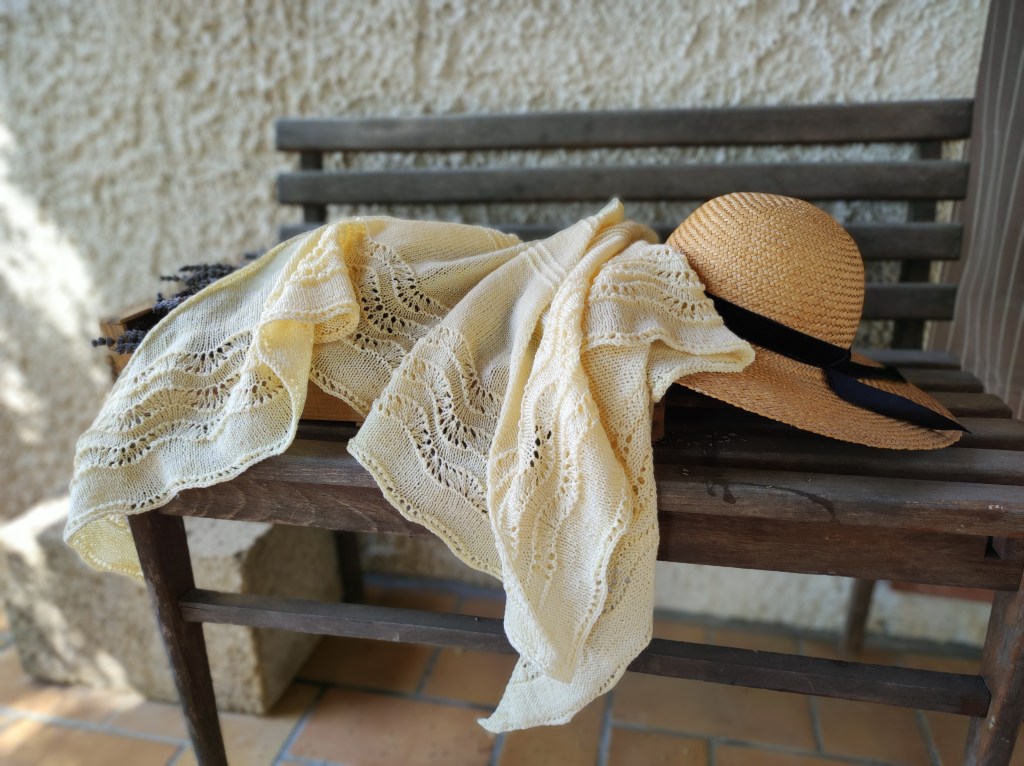 Le chat qui tricote, c’est aussi une boutique-salon de thé à Aix-en-Provence, où on peut venir passer l’après-midi en tricotant, en papotant, et en dégustant les délicieux gâteaux faits maison proposés. On y passe un très agréable moment, même (et surtout) en été, car grâce aux murs épais des vieilles maisons, il y fait bien frais. Il est très difficile d’en repartir les mains vides, car ce sont de véritables merveilles qui sont accrochées un peu partout sur les murs. Et c’est comme ça que lors de ma visite d’avril dernier, je suis repartie avec plusieurs écheveaux, dont deux se sont transformés dans le châle que j’ai le plaisir de vous présenter aujourd’hui !