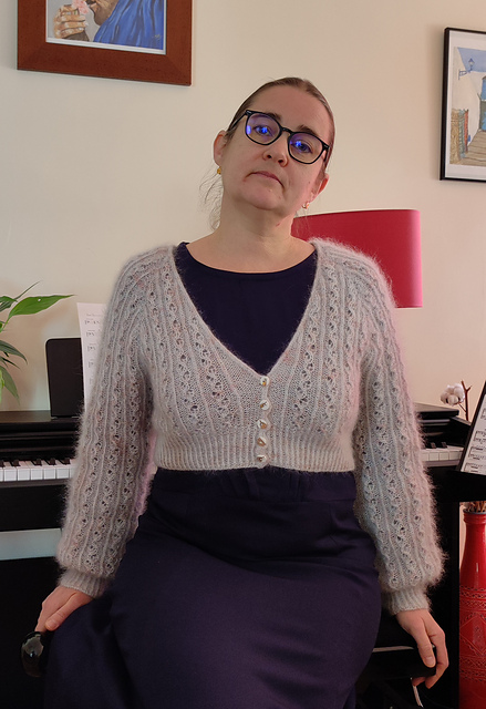 L’association entre torsades et points ajourés, ainsi que la forme du pull (en A inversé) rendent cette pièce originale et inhabituelle. La légèreté du mohair et la dentelle contrastent avec le moelleux des torsades et font de ce pull un vêtement à la fois audacieux et douillet, qui mettra en avant la femme fière qui le portera.