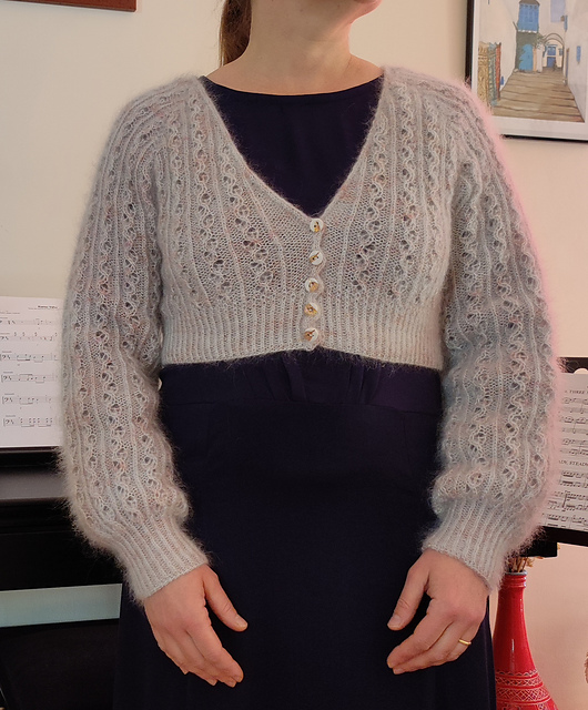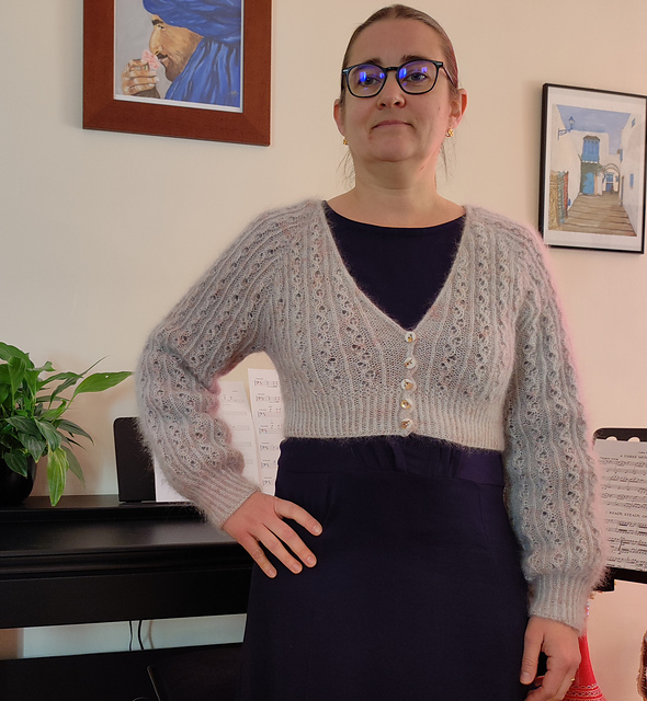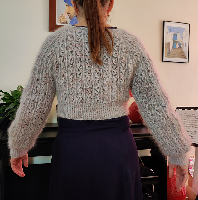 Le devant et le dos comportent un motif de torsades et de dentelles qui se retient facilement et viennent rythmer le tricot. Les manches sont en jersey endroit.
