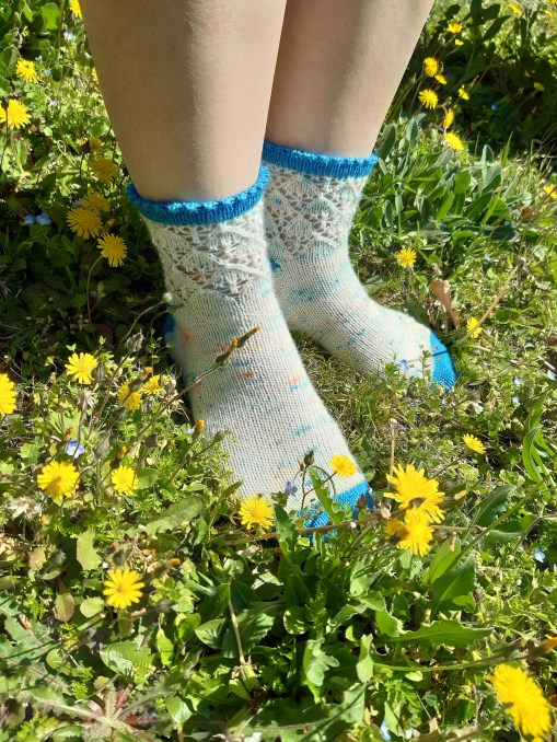 Ces chaussettes m’ont aussi été inspirées par le kit chaussettes lancé par Le chat qui tricote à l’automne dernier. J’ai craqué sur le kit « Martin pêcheur et turquoise » et j’ai tout de suite imaginé une paire de chaussettes très printanières, plutôt courtes et avec de la dentelle.