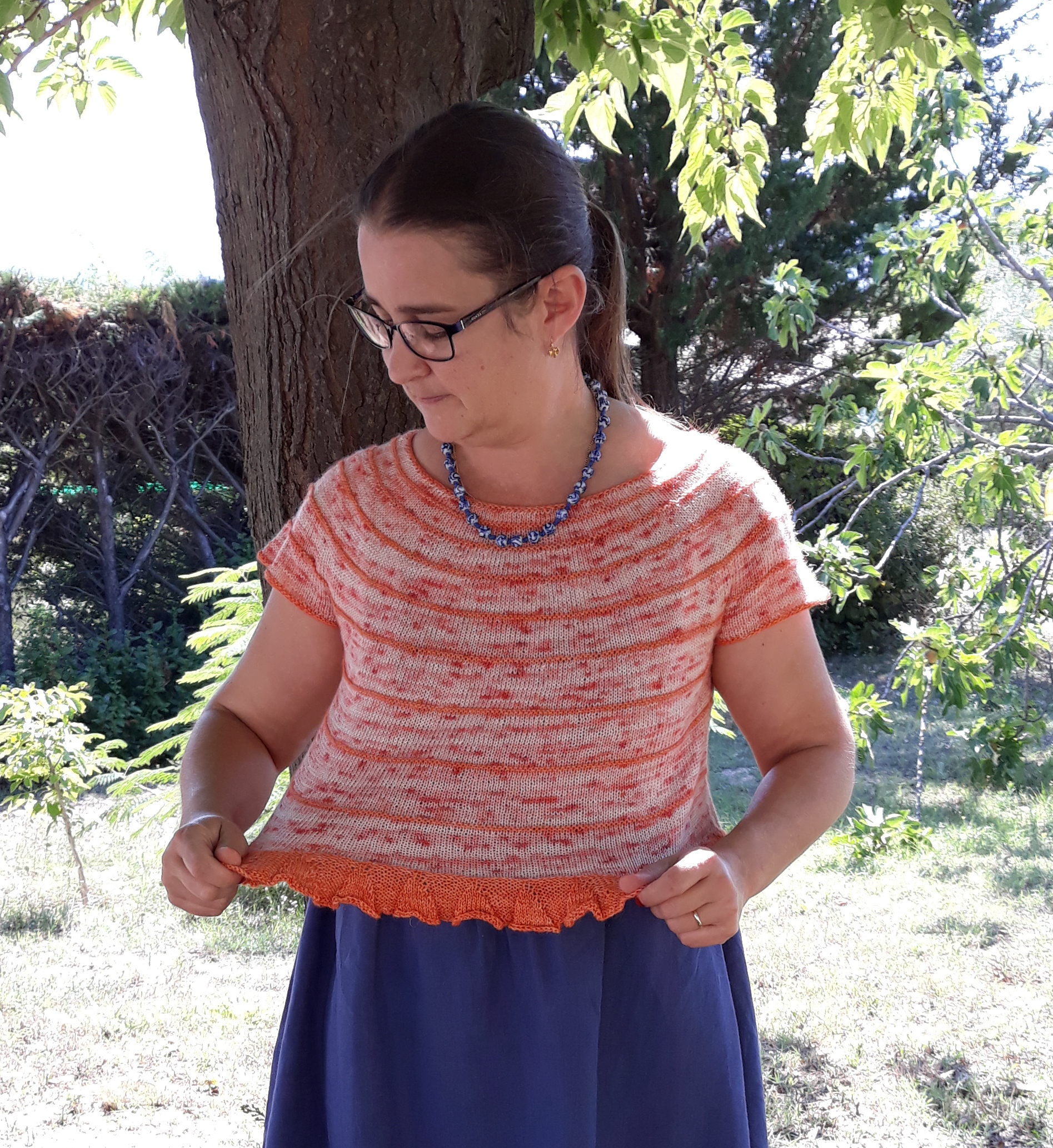 Pour le tricoter, j’ai choisi le fil Aurore, une nouvelle base de Les laines du scarabée, que j’ai testée à cette occasion et qui m’a vraiment ravie. Elle est très agréable à tricoter et je sens que je vais la porter avec plaisir pendant tout l’été.